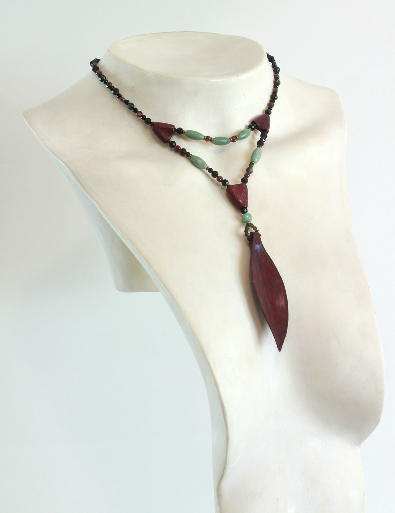 Ce bijou artisanal en bois sculpté d’Amarante se distingue par sa feuille sculptée aux reflets pourpres profonds, soutenue par des pièces intermédiaires artisanales.