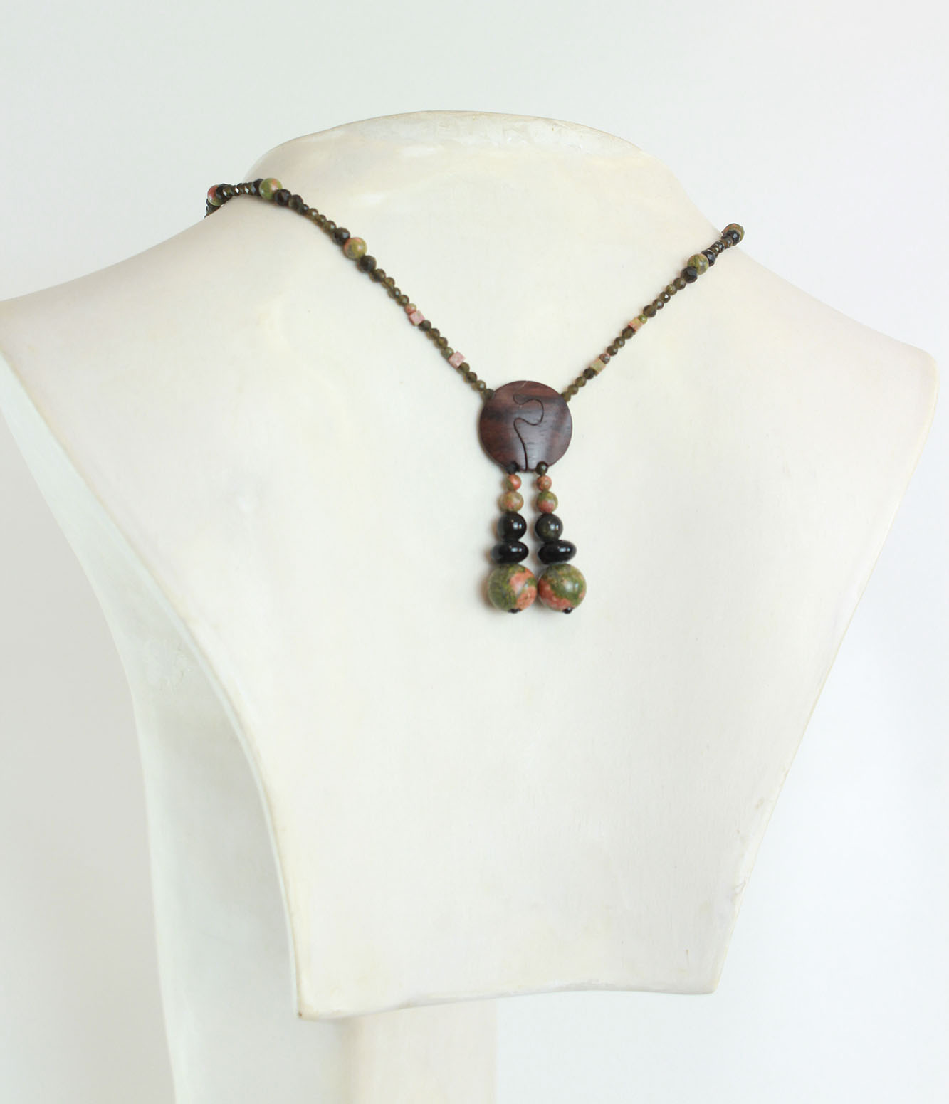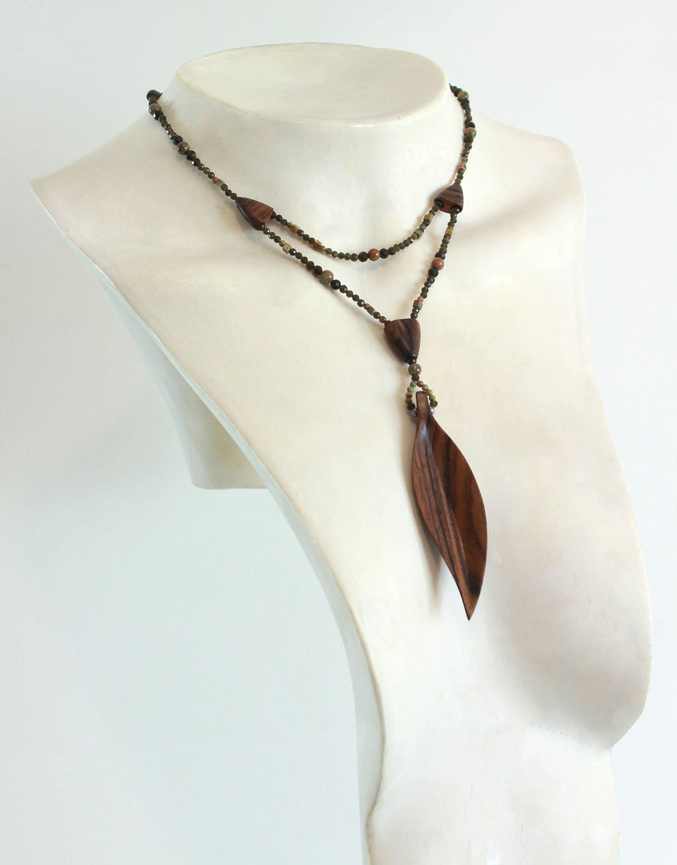 Ce collier sobre et raffiné marie la noblesse veinée du Palissandre Santos, sculpté en feuille élancée, à l’énergie tellurique des perles d’Unakite et d’Obsidienne.