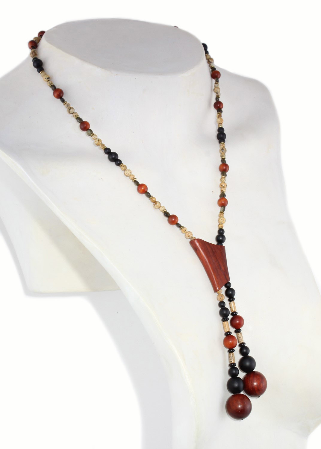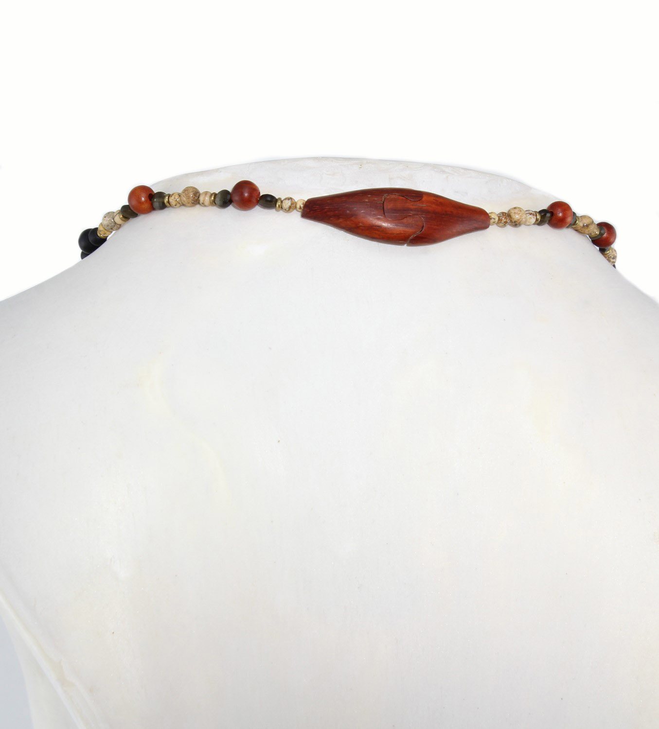 Collier cravate tribal en bois de Padouk et perles de Santal – Bijou artisanal en bois sculpté