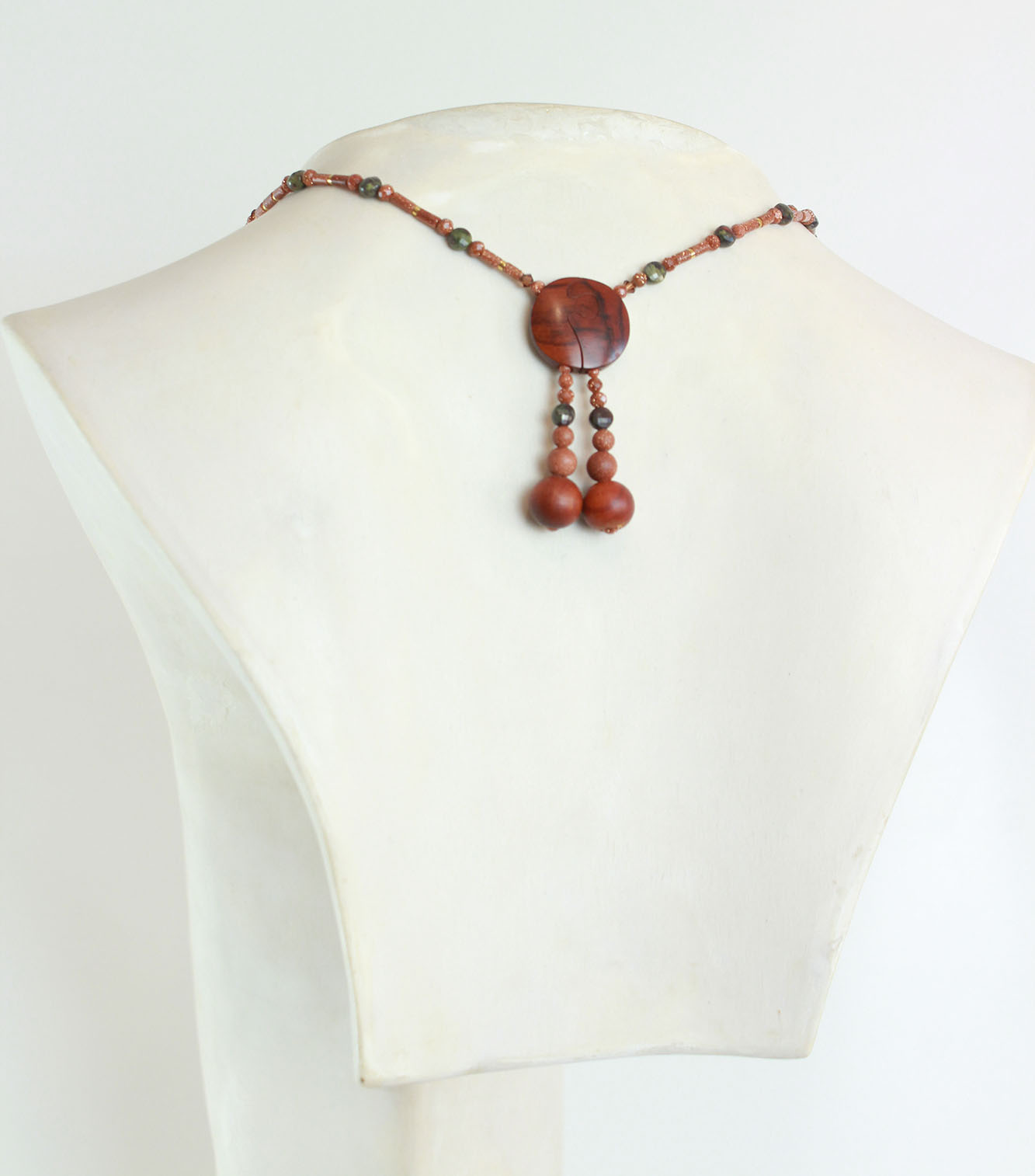 Collier en bois exotique sculpté & pierre du Soleil – Bijou artisanal en bois sculpté