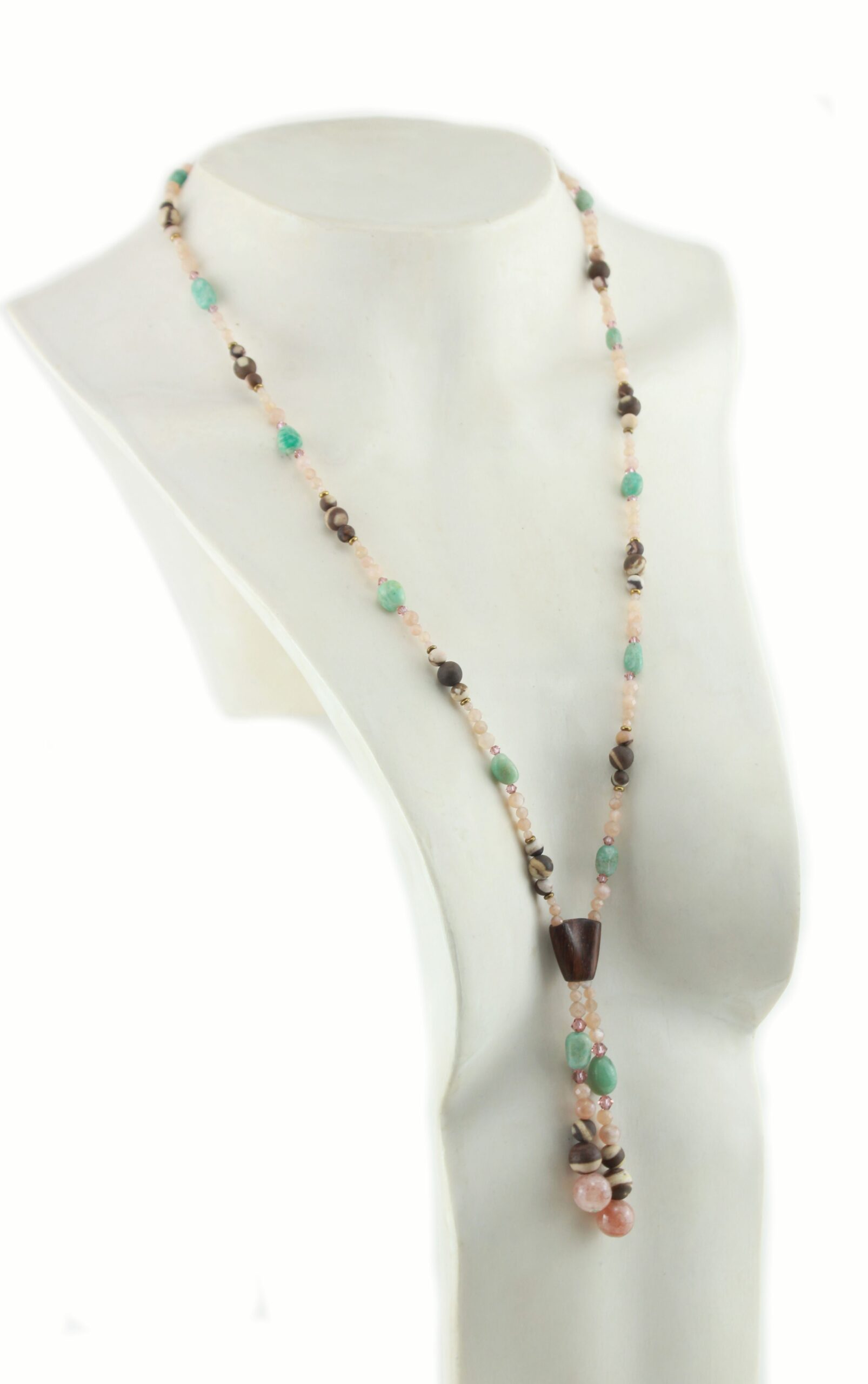 Sautoir vintage en perles naturelles d’Aventurine et bois d’Angélique – Bijou artisanal en bois sculpté