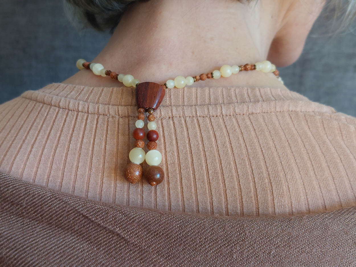 Je vous rassure Mesdames, l’entretien d’un collier en bois et en pierres ne nécessite que peu de temps ! Il est bien plus qu’un simple bijou. Il porte en lui la mémoire du bois sculpté, l’énergie des pierres qui le composent et l’intention de l’artisan qui l’a façonné. Comme notre propre corps, il évolue avec le temps, il respire, il s’imprègne des éléments et des mouvements de la vie. Pour préserver sa beauté et sa force, il demande une attention particulière, une bienveillance quotidienne.