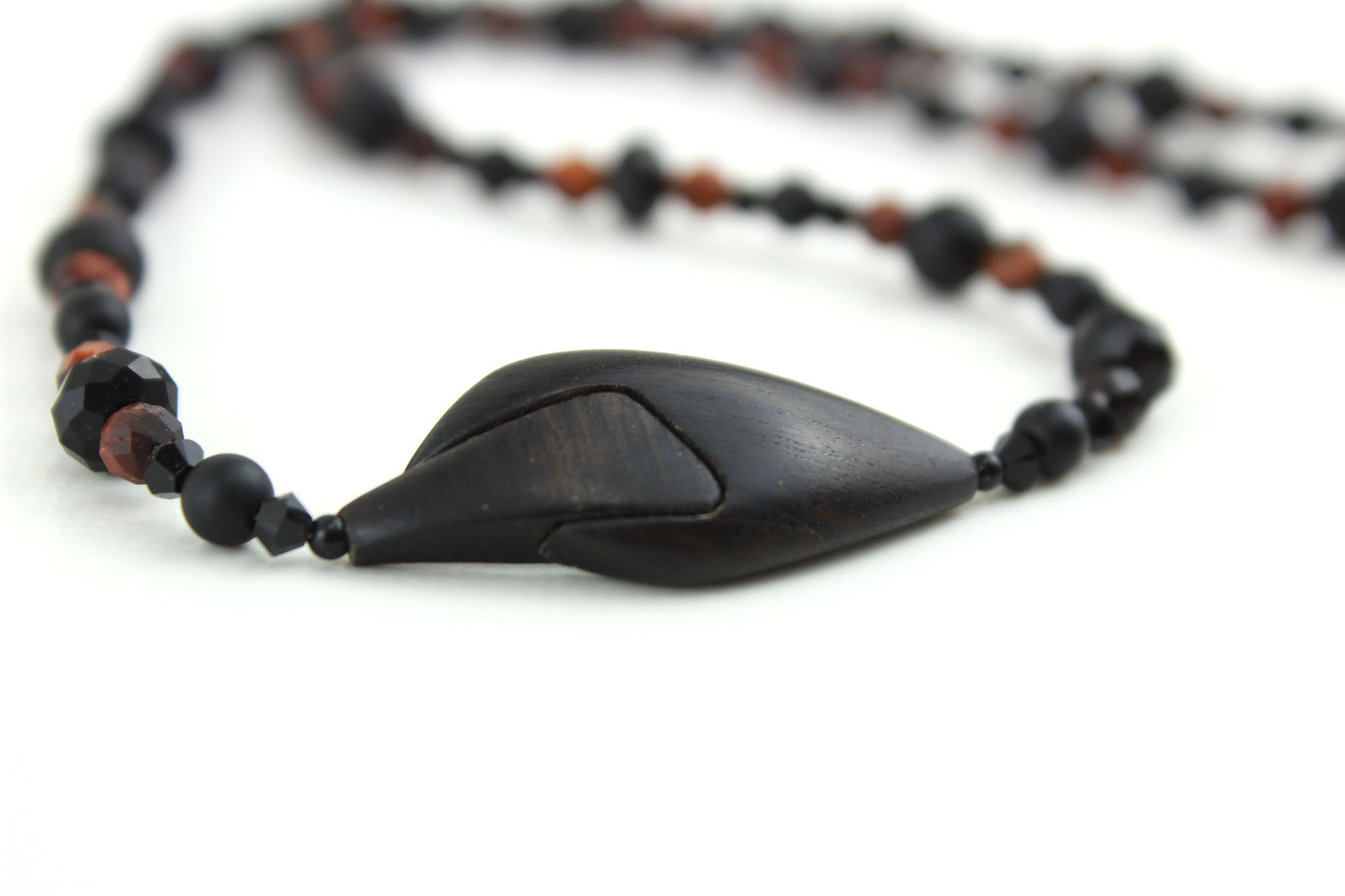 Collier design en bois de Camel Thorn & obsidienne – Bijou artisanal en bois sculpté