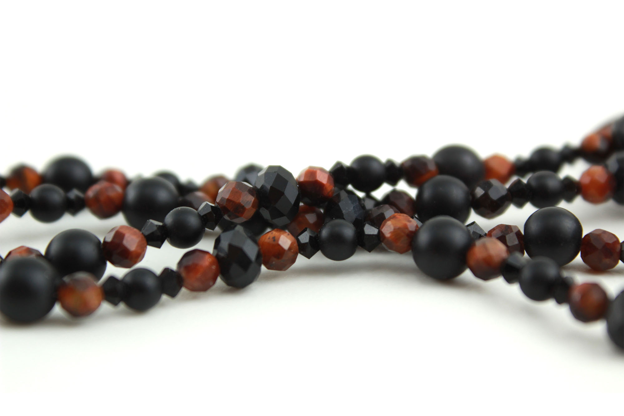 Le fermoir puzzle aimanté, lui aussi sculpté à la main, apporte une touche design raffinée, aussi ingénieuse qu’esthétique. Les perles d’Obsidienne, d’Œil de taureau, d’Onyx et quelques éclats cristallins accentuent l’intensité de l’ensemble, jouant sur les contrastes entre lumière et ombre.