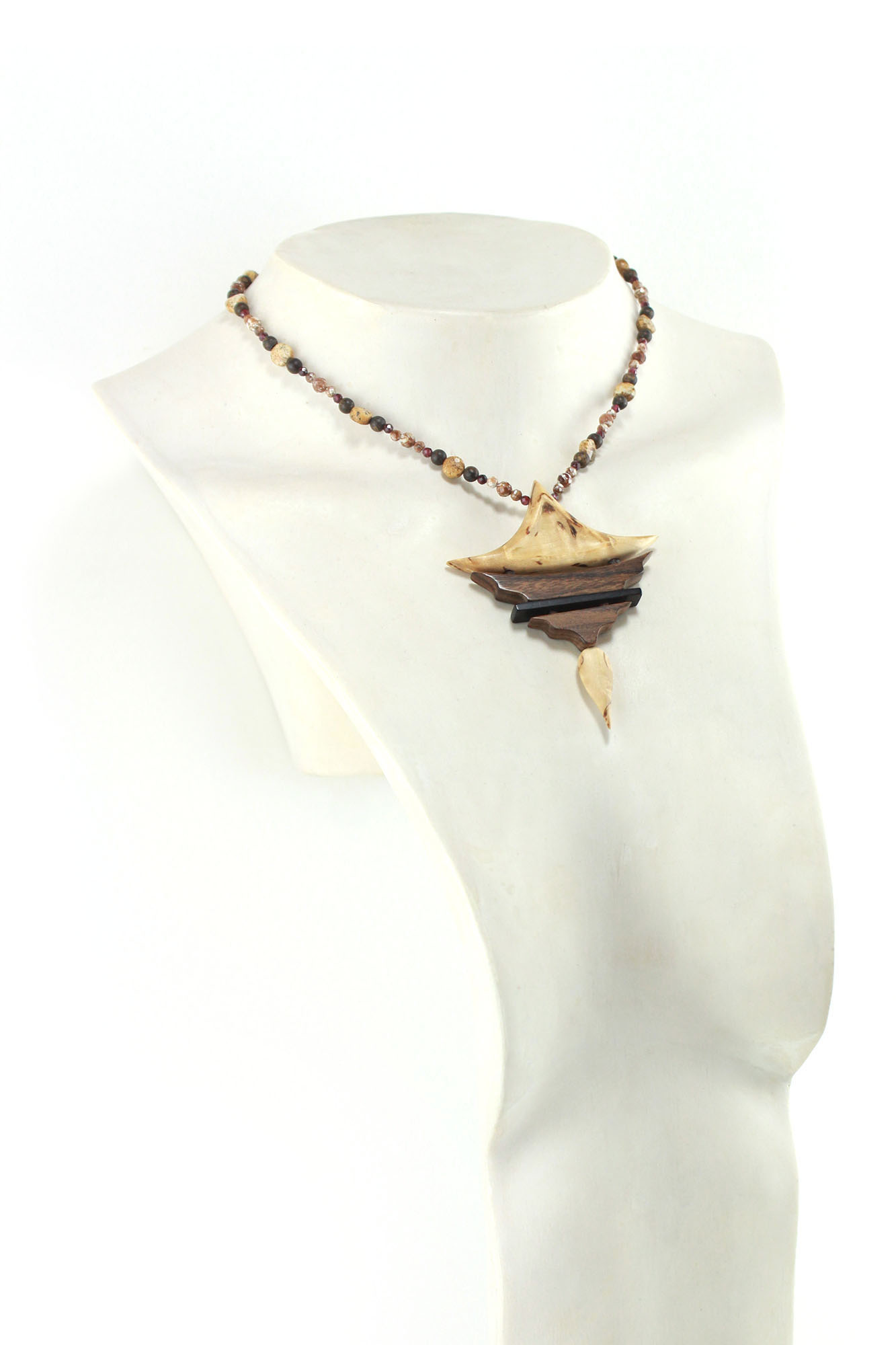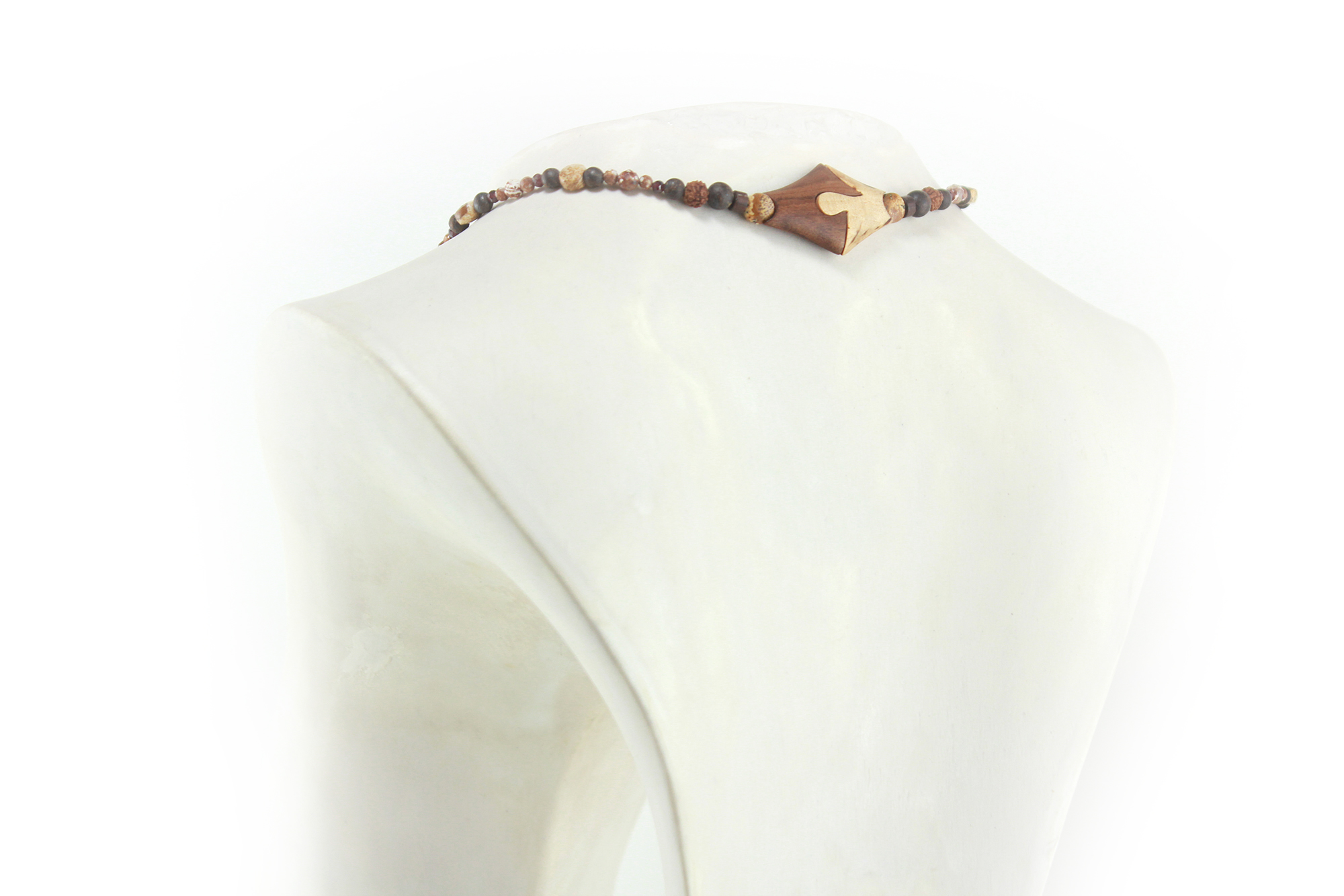 Collier japonais en bois précieux de Palissandre et perles de Jaspe – Bijou artisanal en bois sculpté