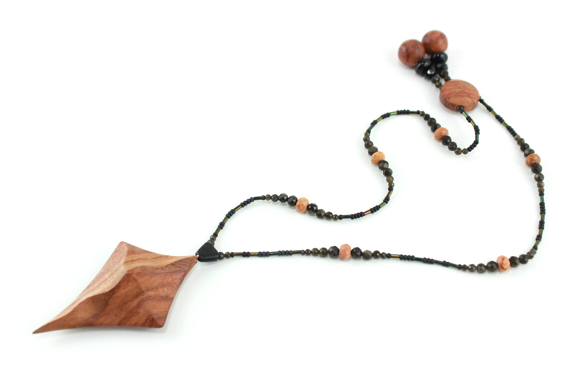 Le fermoir aimanté, conçu dans le même bois précieux, s’intègre avec naturel, prolongeant la continuité organique du bijou. Le double pendant, à l’avant et à l’arrière, crée une signature singulière : un jeu de miroir entre le visible et l’invisible, entre le souffle et la matière.