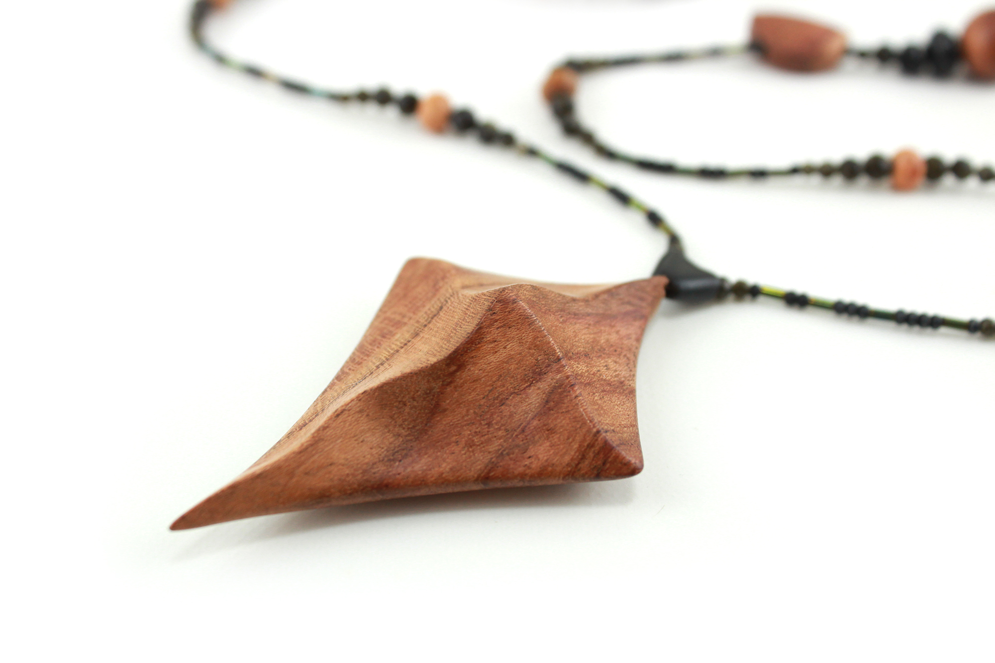 Sculpté à la main, son pendentif déploie des lignes angulaires et fluides.
