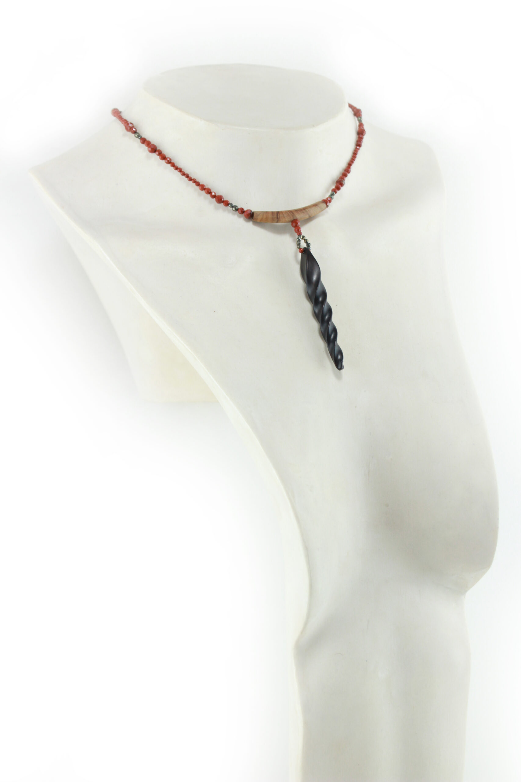 Ce collier talisman incarne la puissance contenue et l’équilibre des forces. La vrille sculptée en Ébène, suspendue comme un souffle ascendant, symbolise la transformation et l’élan vital. Au centre, la pièce d’Olivier agit comme un point d’équilibre — une respiration lumineuse entre la profondeur du bois sombre et la chaleur du vivant.