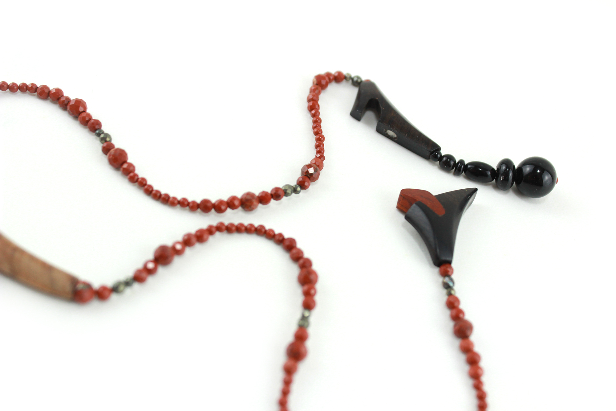 Le fermoir aimanté, façonné en puzzle dans l’Ébène avec une touche de Cocobolo, prolonge cette harmonie organique en épousant naturellement la courbe du cou. Les perles naturelles, aux nuances rouge feu et reflets métalliques, tissent autour du bois un dialogue entre ancrage et éclat. À l’arrière, un pendentif discret en Onyx parachève la ligne avec élégance.