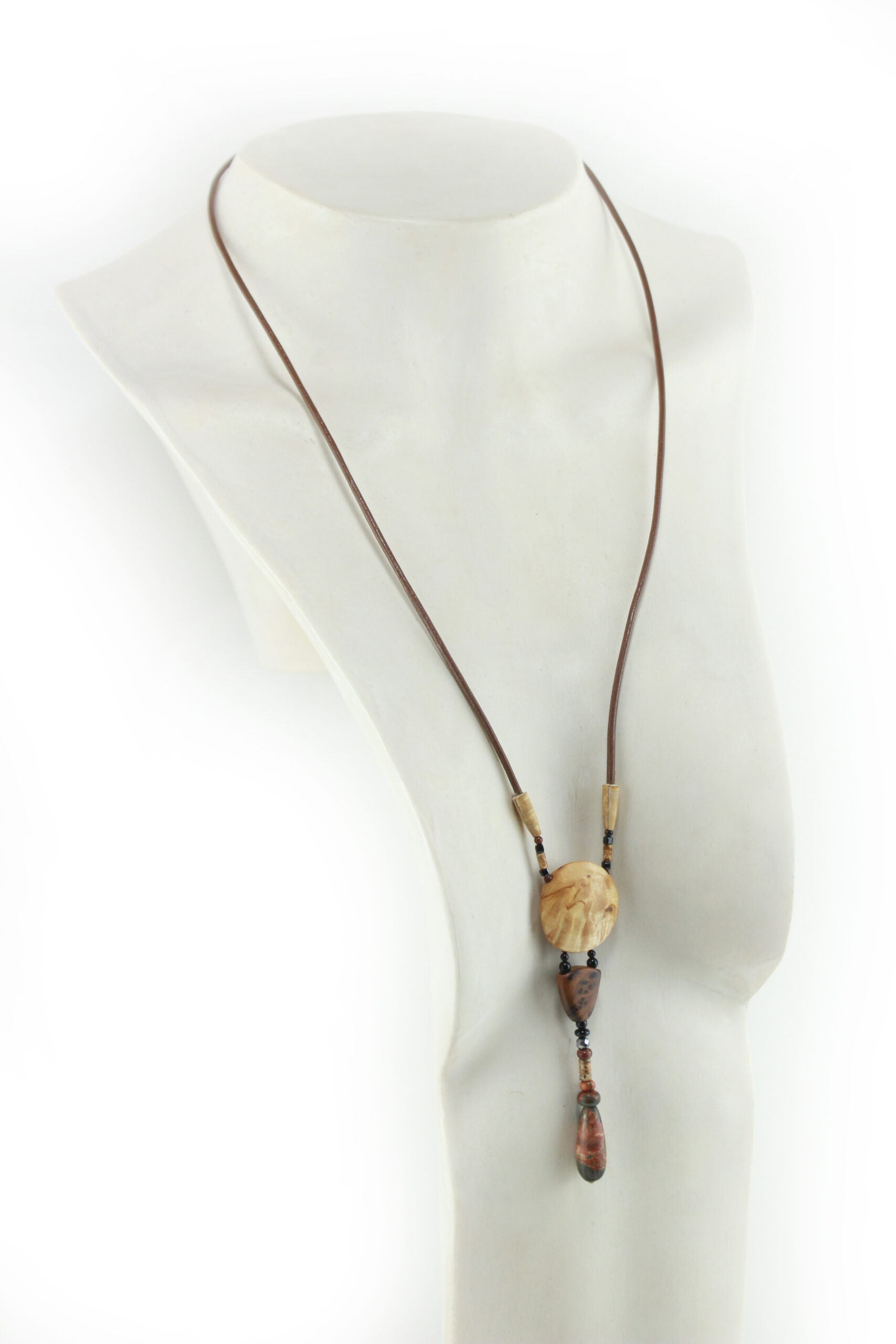 Sautoir ethnique en bois sculpté & Jaspe Picasso – Bijou artisanal en bois