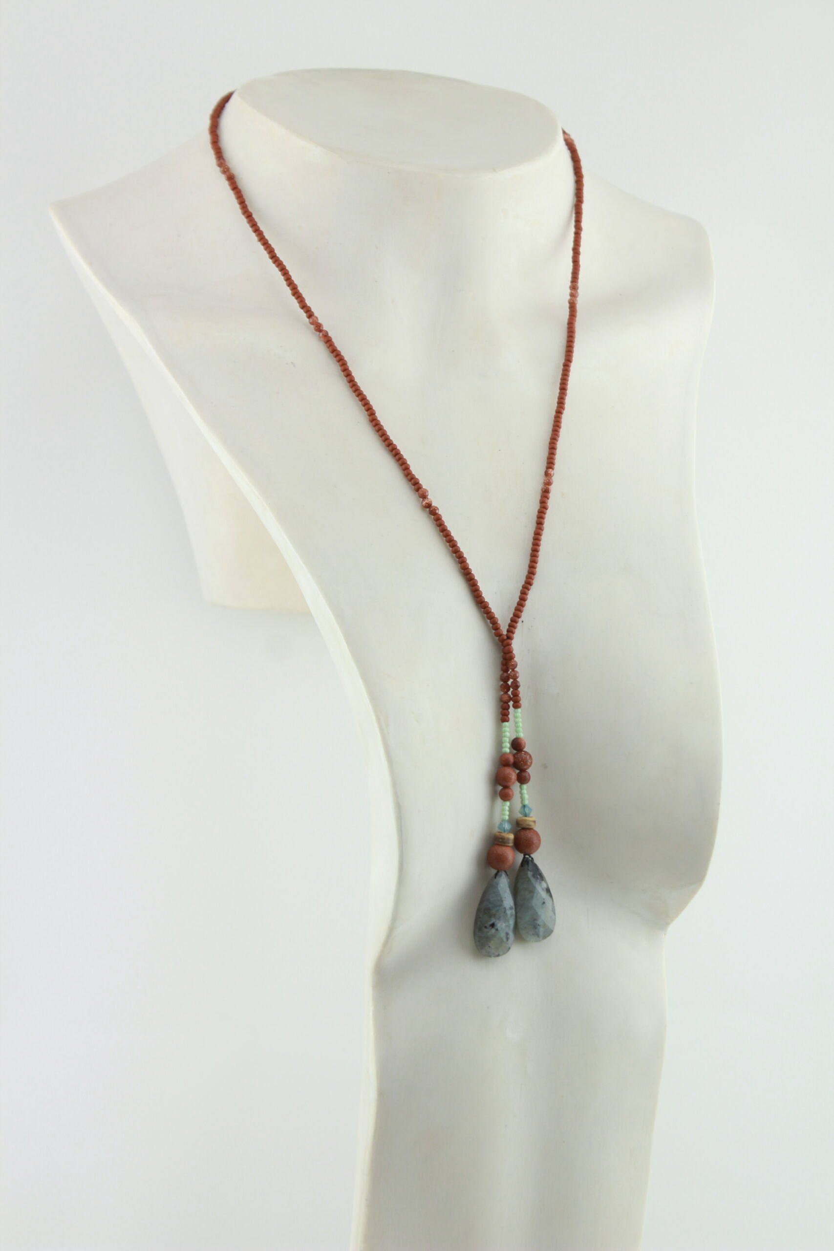 Un collier lasso Amérindien en perles naturelles de Labradorite qui évoque les vastes plaines et la danse des ombres sous le feu du couchant. Une alliance de teintes naturelles, entre la profondeur mystique de la Labradorite et la chaleur du Sable d’Or, relevée par des éclats de cristal bleu et des touches de vert pâle. Un hommage aux énergies nomades, à l’instinct et à la liberté intérieure.