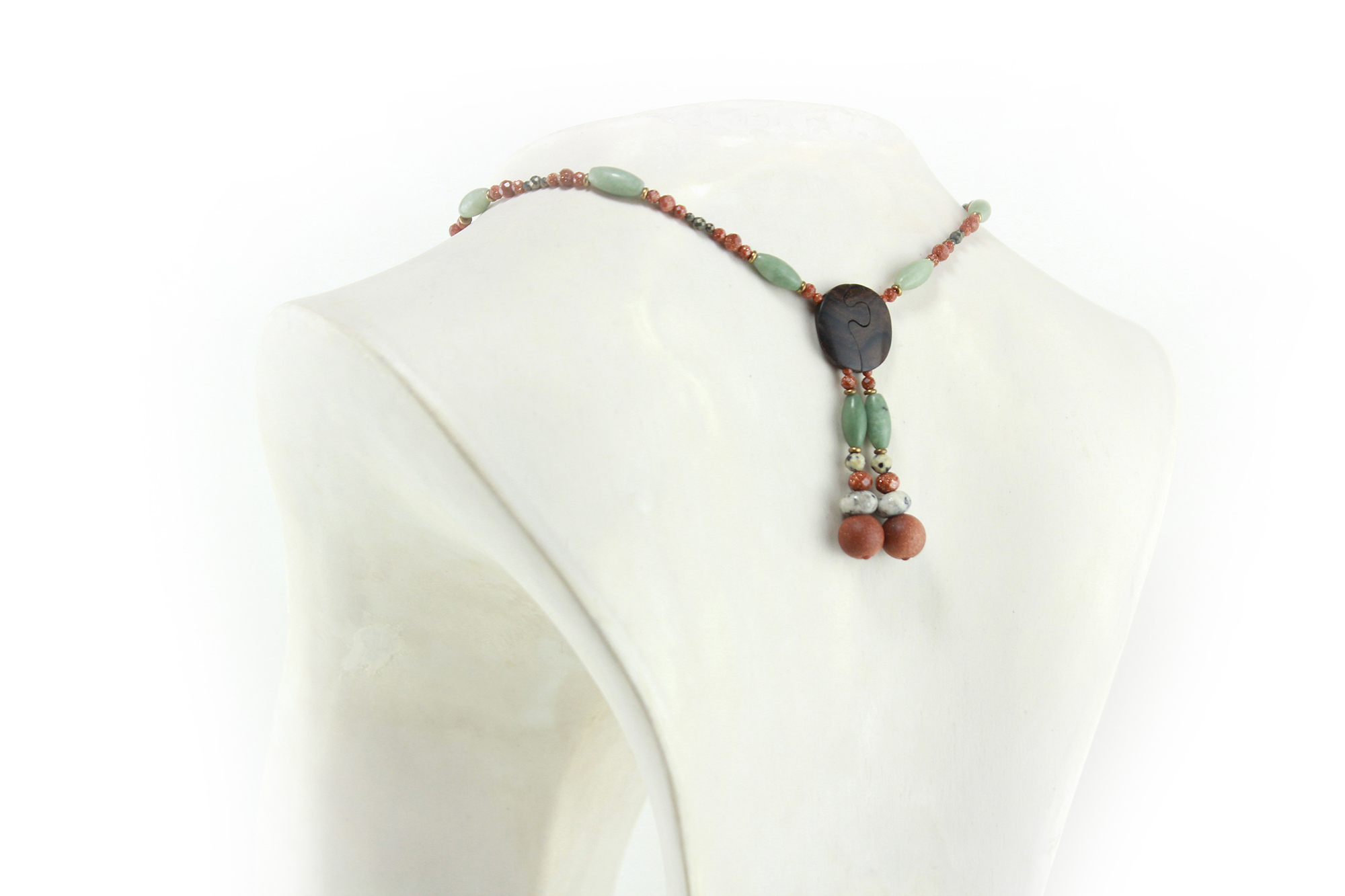 Collier totem en bois exotiques et Jaspe Picasso – Bijou unique fait main