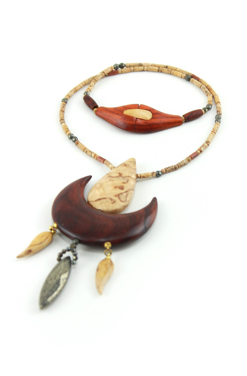 Collier ras-de-cou demi-lune tribale en bois de Cocobolo et Jaspe – Bijou artisanal en bois sculpté