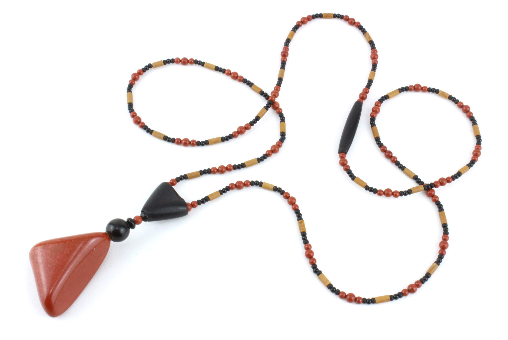 Le collier est rythmé par une alternance subtile de perles de Jaspe rouge, de Jaspe jaune et d’Onyx noir, dont les couleurs intenses rappellent les terres brûlées, l’ombre et la lumière. Chaque perle, chaque pièce de bois sculptée, porte la trace du geste artisanal et confère à l’ensemble un caractère unique.