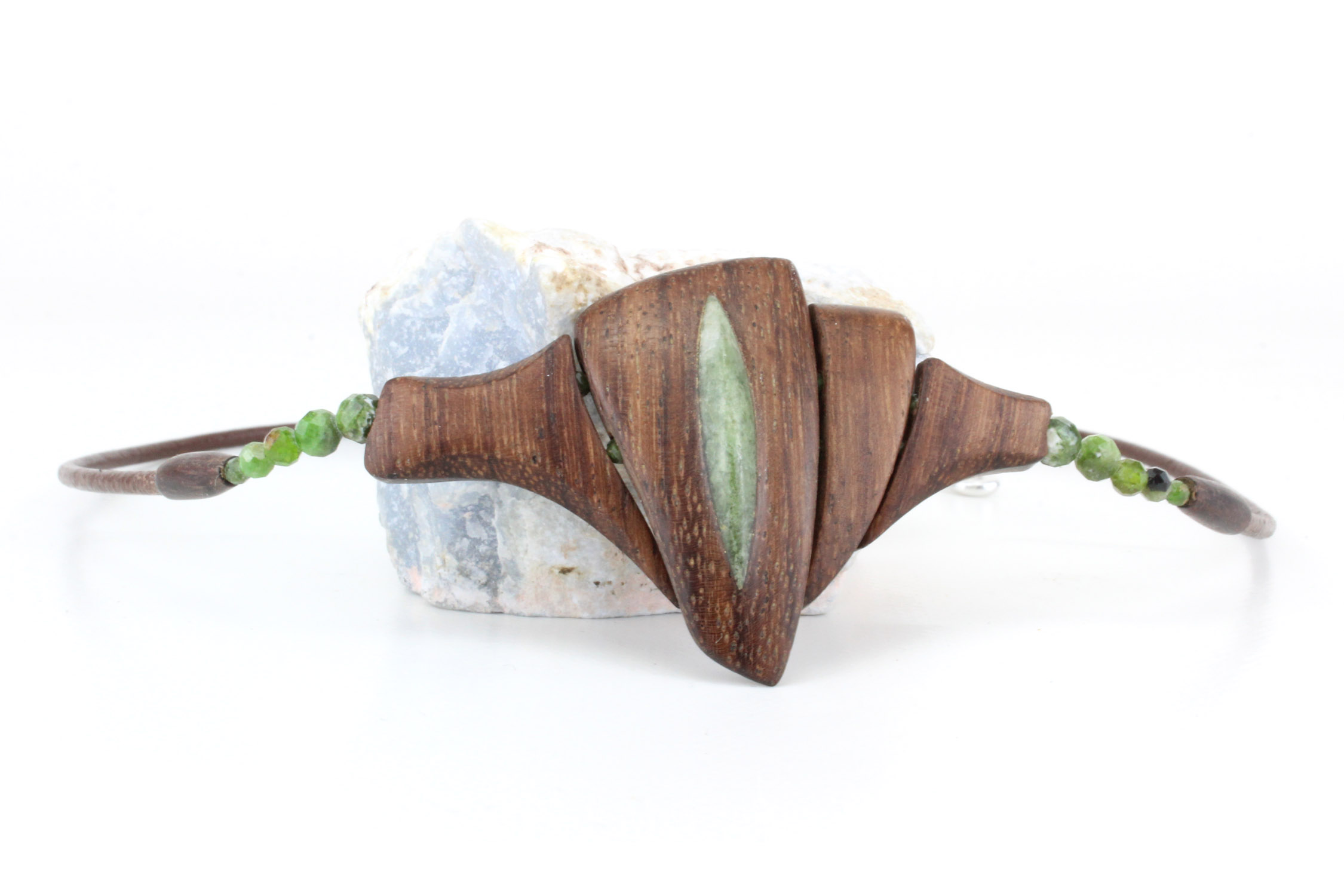 Sculpté à la main dans un bois de Palissandre Santos, ce bijou incarne la puissance tranquille d’un féminin enraciné. Son cœur vert, une diopside taillée à la main, semble jaillir de l’écorce comme une gemme brute, douce Y végétale. Chaque ligne suit la forme d’une feuille qui se déploie, d’un bourgeon qui s’ouvre, d’un secret ancien.