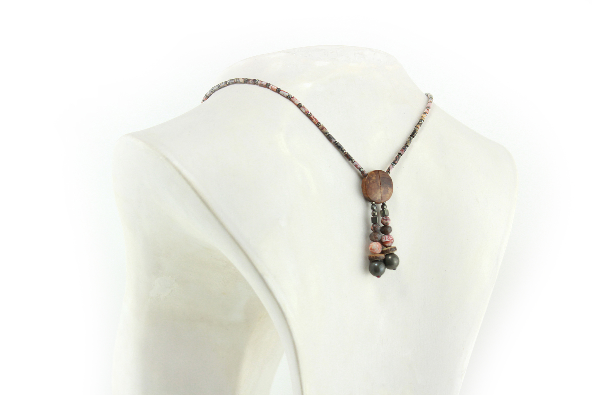 - Matières brutes et naturelles : Ce collier s’accorde parfaitement avec des textiles ayant un aspect brut comme du lin, du coton épais, du chanvre ou de la laine tissée. Ces matières évoquent un lien avec la nature et renforcent son côté organique.
