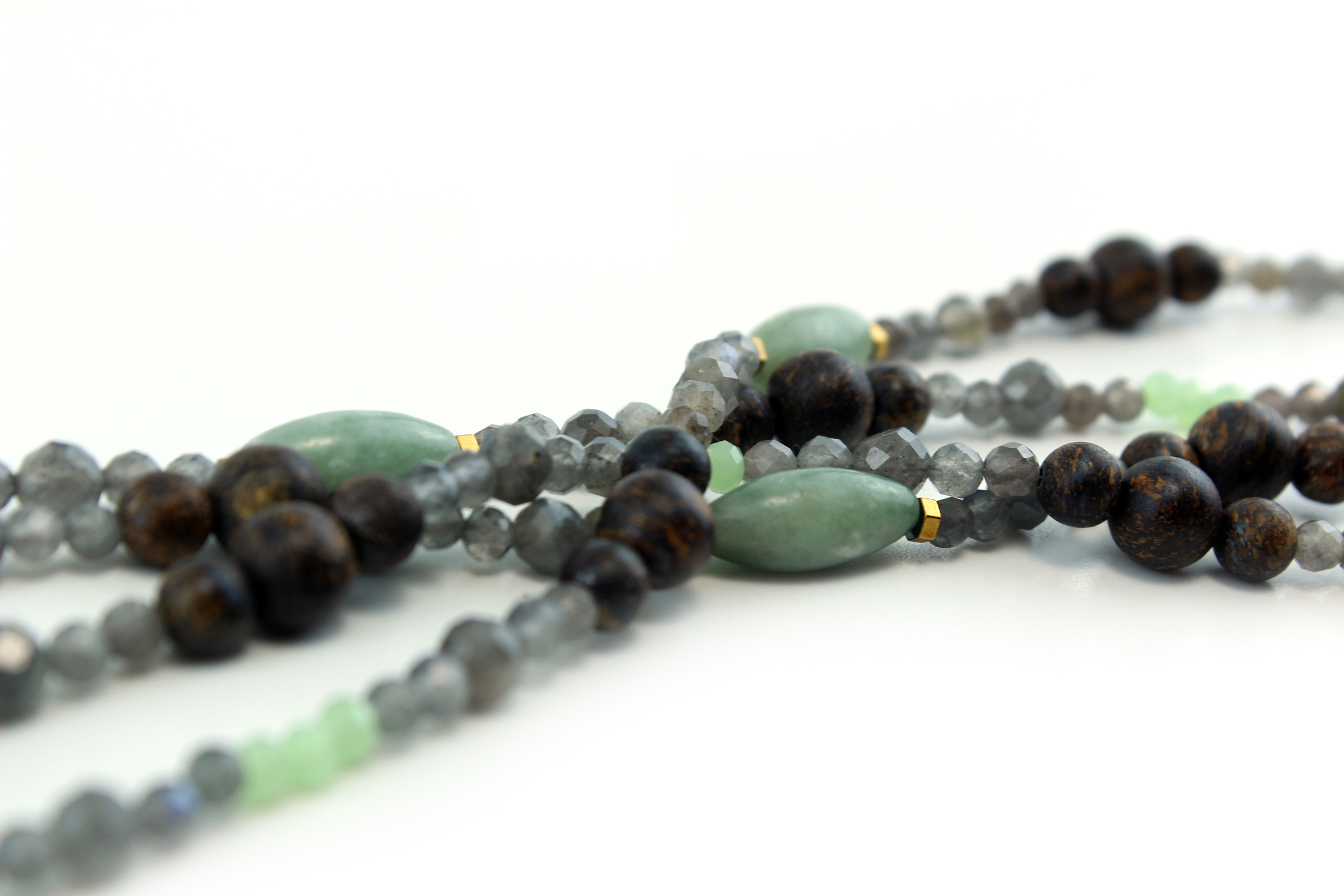 Chaque perle a été soigneusement sélectionnée et assemblée à la main pour préserver l’harmonie naturelle des couleurs et des textures. La pièce intermédiaire en bois de Movingui, sculptée artisanalement, apporte une note chaleureuse et solaire, contrastant avec les nuances plus profondes des pierres.
