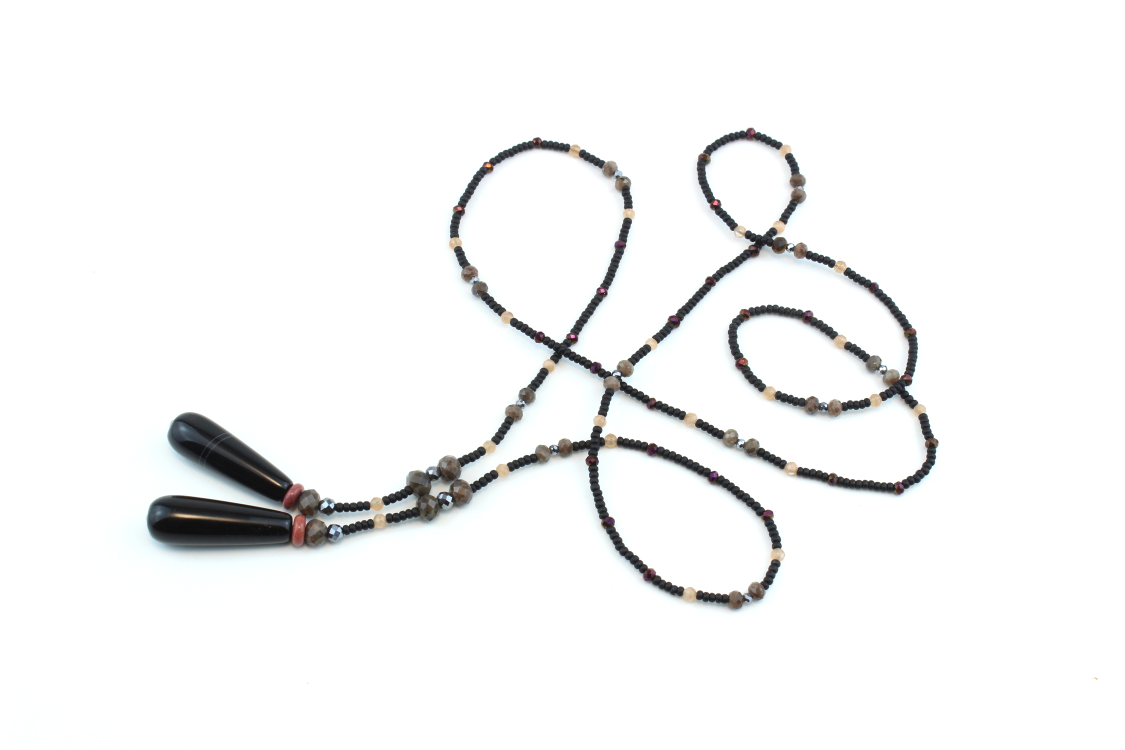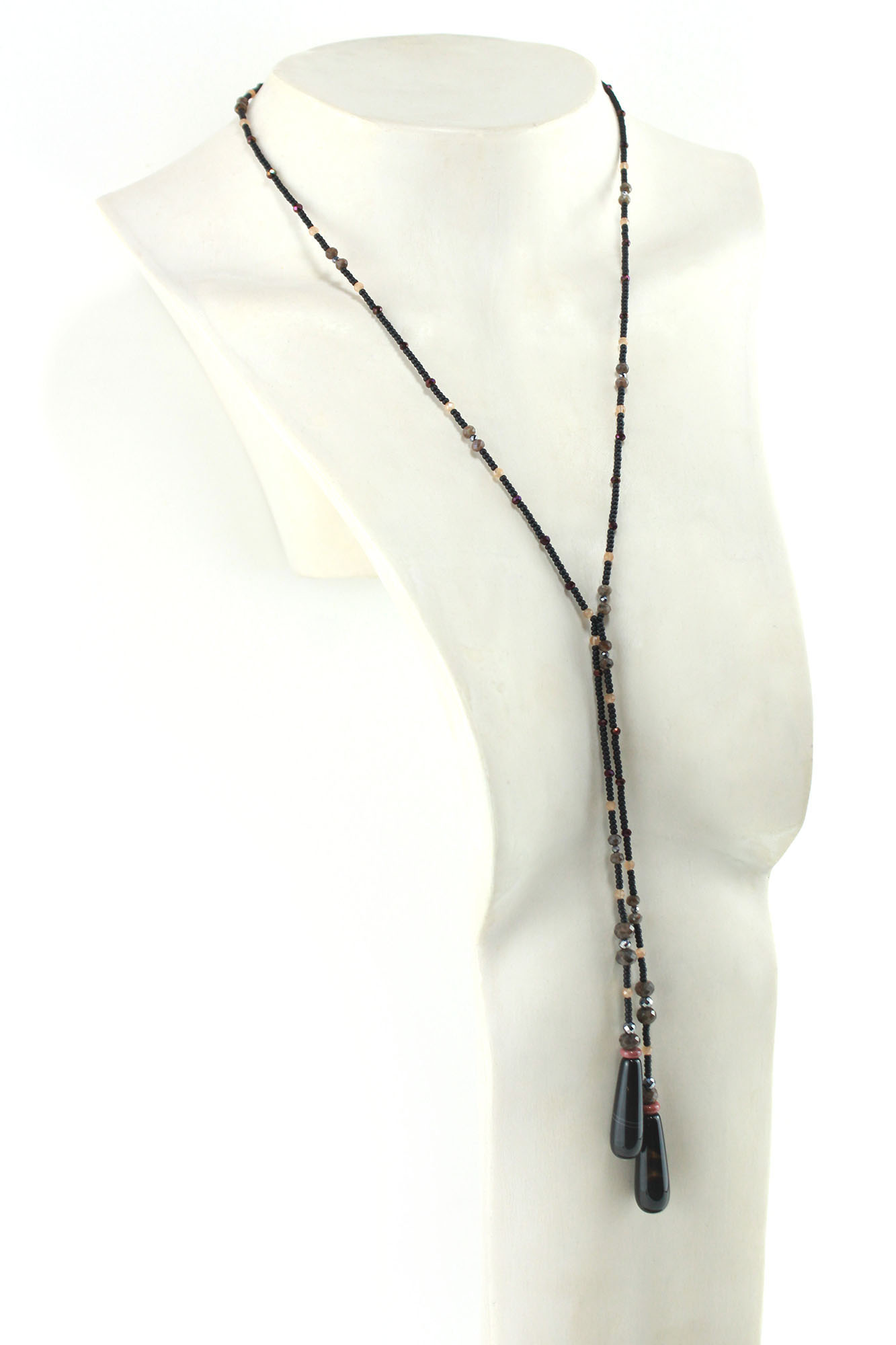 Chaque lariat est conçu avec des finitions impeccables : aucun nœud visible, des perles minutieusement sélectionnées une à une pour l’harmonie des lignes, et un système à nouer innovant qui en fait un bijou unique sur le marché.