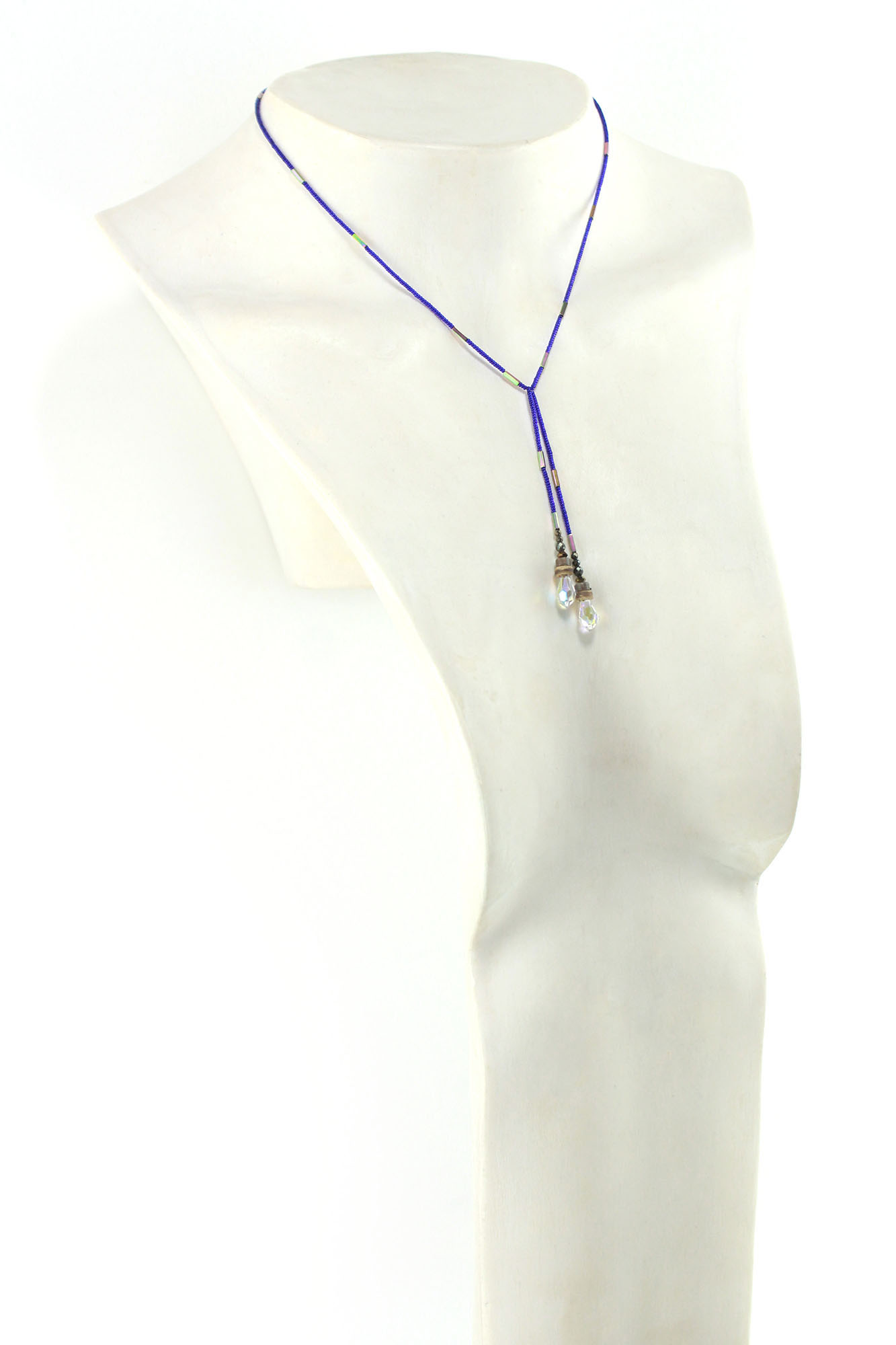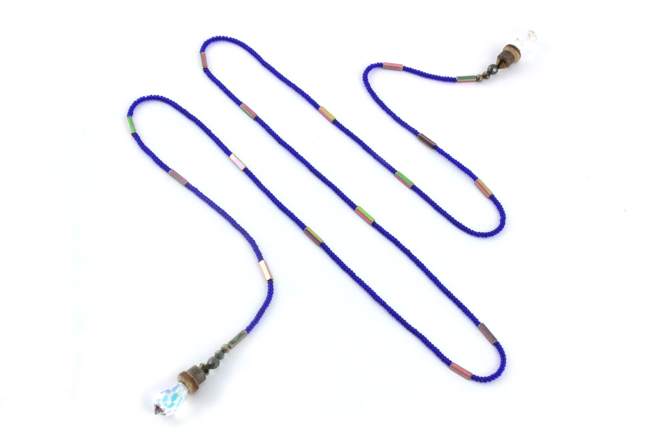 Ce collier court associe l’intensité d’un bleu profond à l’éclat argenté des cristaux facettés. Comme un ciel nocturne traversé d’étoiles, il capte la lumière avec subtilité, révélant tantôt des reflets doux, tantôt des éclats vifs.