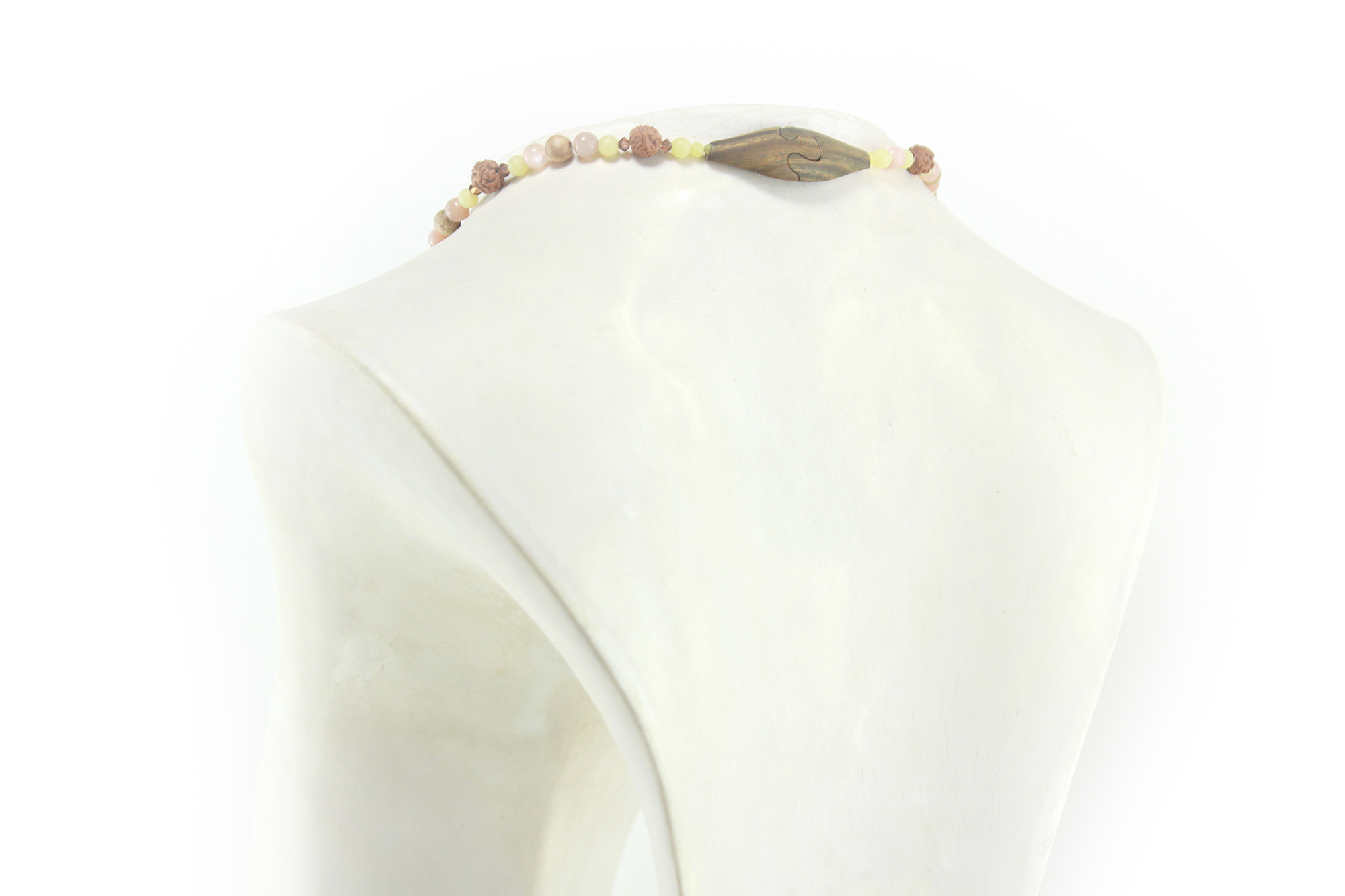 Il legno si ammorbidisce e sviluppa una patina quando viene toccato dalla pelle, ma può anche seccarsi se non viene trattato. Le perle, sia minerali che organiche, assorbono la luce e l'ambiente e meritano di essere protette dalle aggressioni esterne. Prendersi cura della propria collana non significa solo prolungarne la vita, ma anche rispettarne il materiale, onorare ciò che è naturale e lasciarlo fiorire nel tempo.