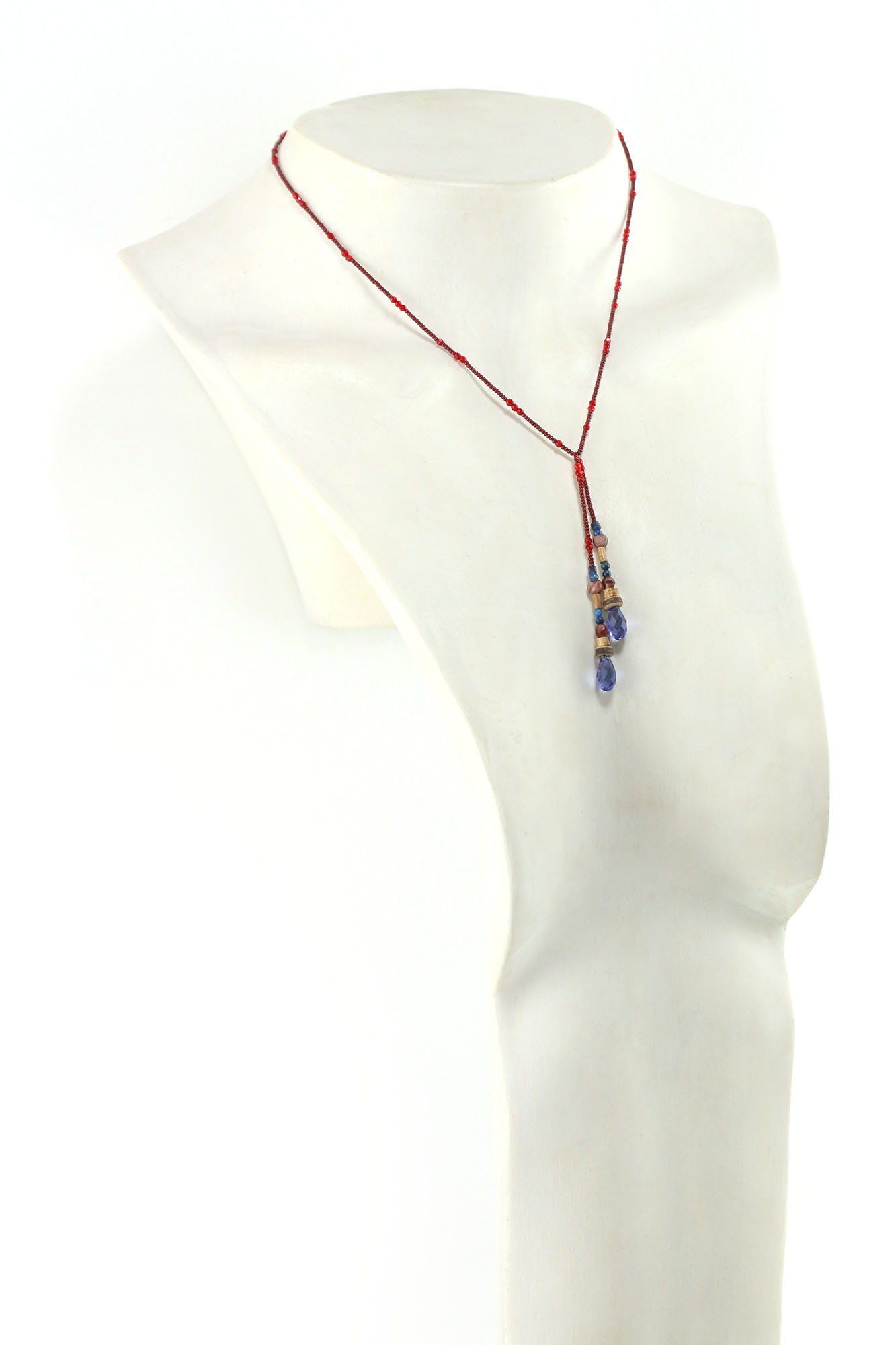 Lasso Talisman en cristal Bleu Saphir & perles rouge rubis – Bijou artisanal fait main