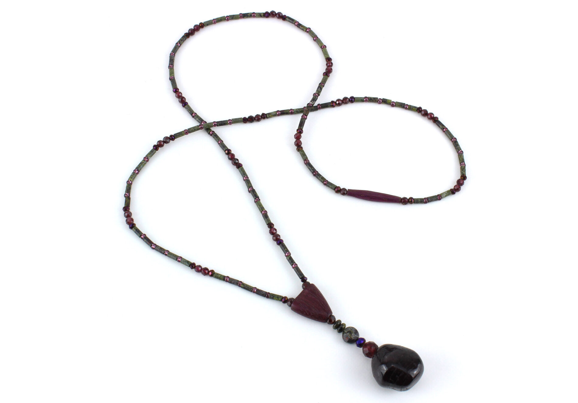 Le collier lui-même est rythmé par un jeu de perles naturelles de Grenat et de Jaspe, aux nuances mêlant le pourpre, le vert et le brun profond, évoquant une nature vibrante et sauvage. Une pièce de fermeture en bois d’Amarante sculpté ferme le collier avec discrétion et raffinement.