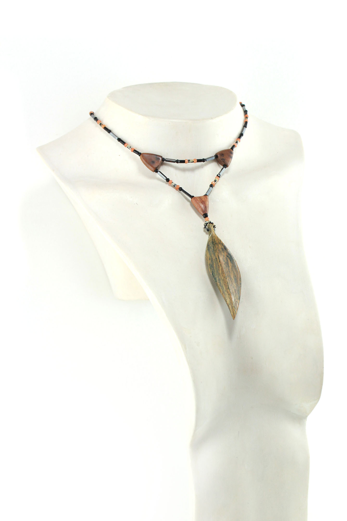 Collier tendance artisanal sculpté à la main, un bijou unit la chaleur du bois et la force minérale.