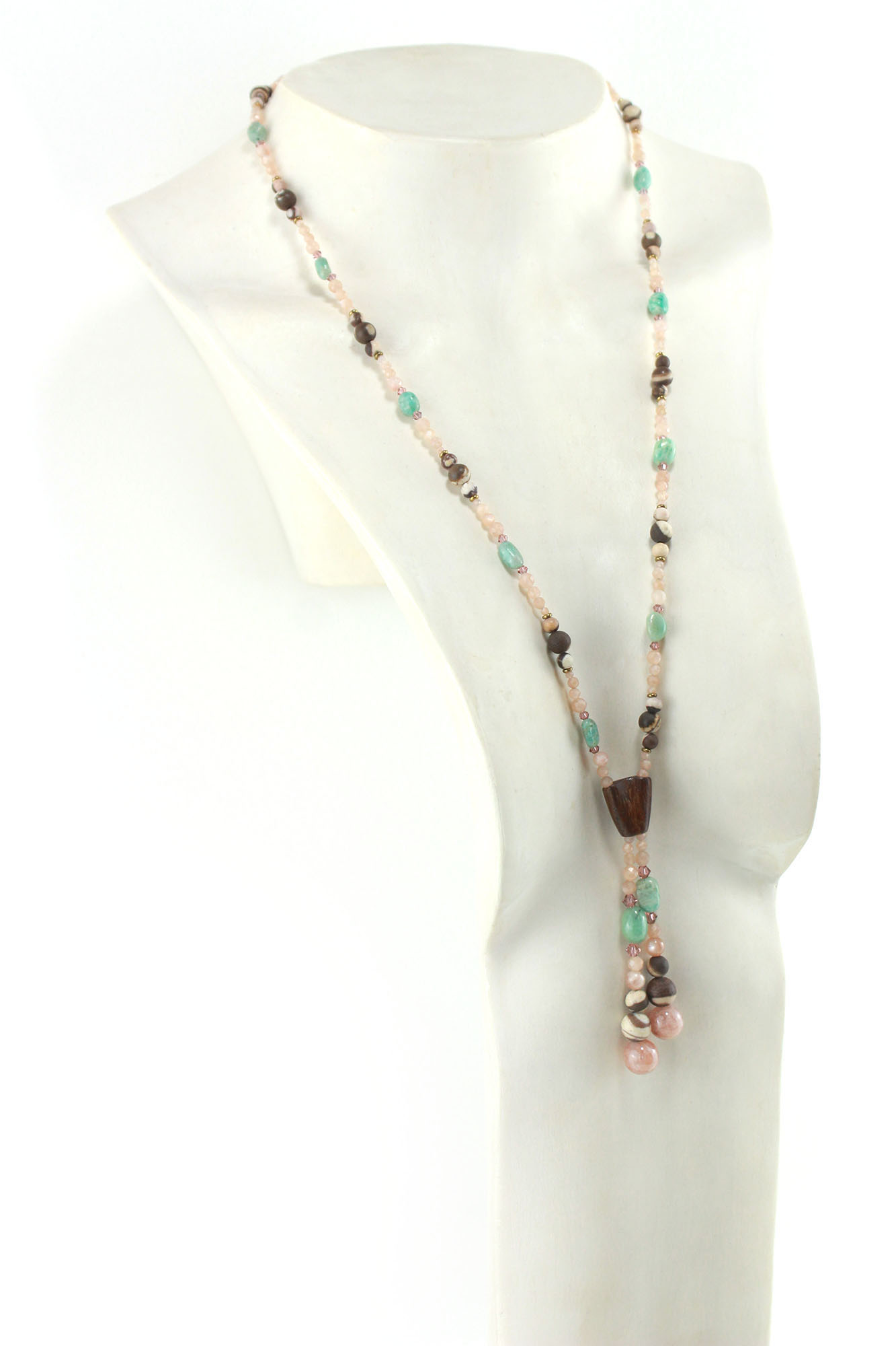 Sautoir vintage en perles naturelles d’Aventurine et bois d’Angélique – Bijou artisanal en bois sculpté