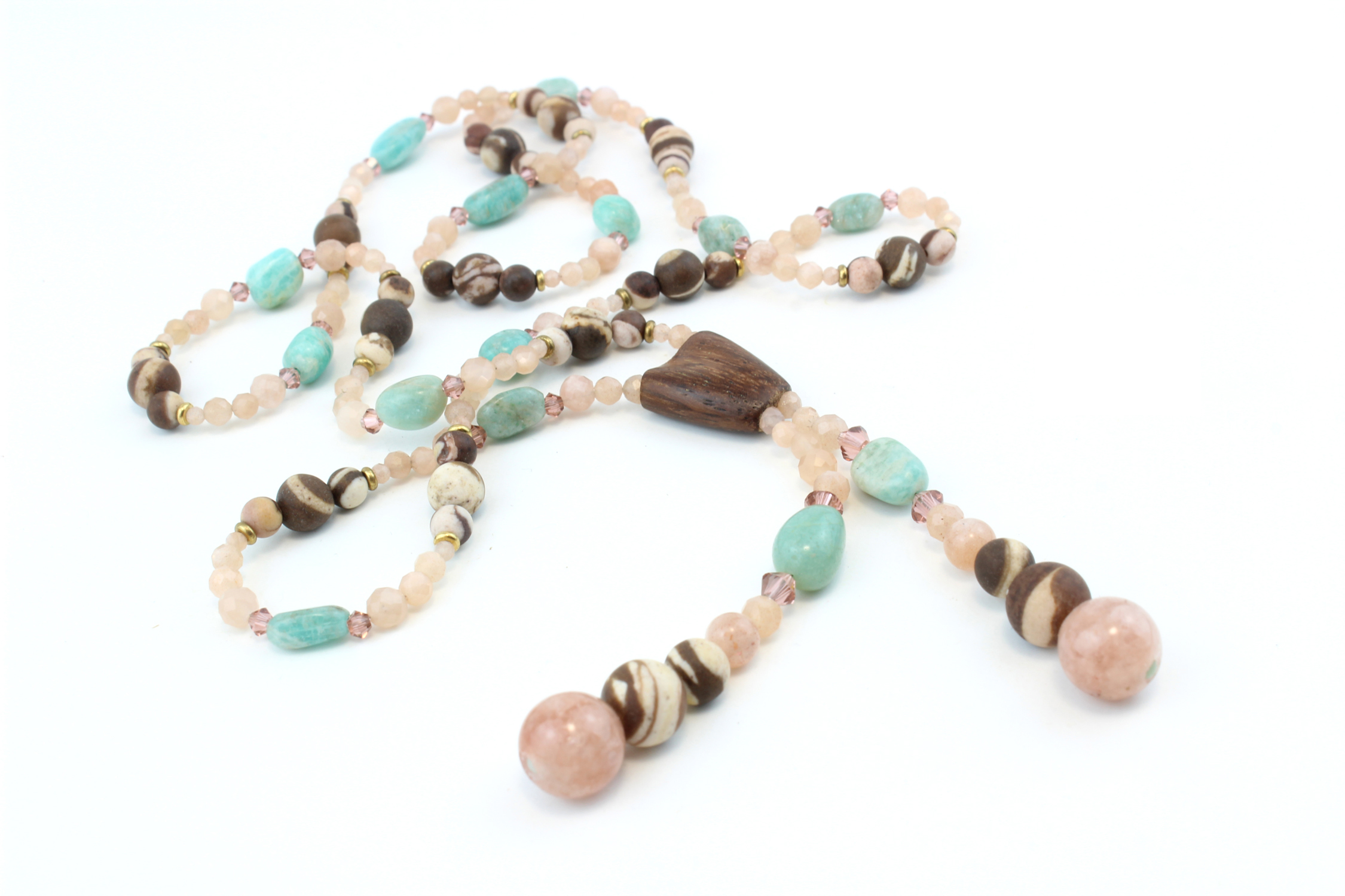L’éclat beige rosé des perles de pierre du Soleil diffuse une chaleur apaisante, tandis que le turquoise lumineux de l’Aventurine insuffle une énergie vivifiante et aérienne. Le brun profond du Jaspe et du bois d’Angélique vient ancrer l’ensemble, apportant une force organique et sophistiquée. Ce bijou est un équilibre subtil entre légèreté et profondeur, un talisman qui relie la nature et l’élégance intemporelle.